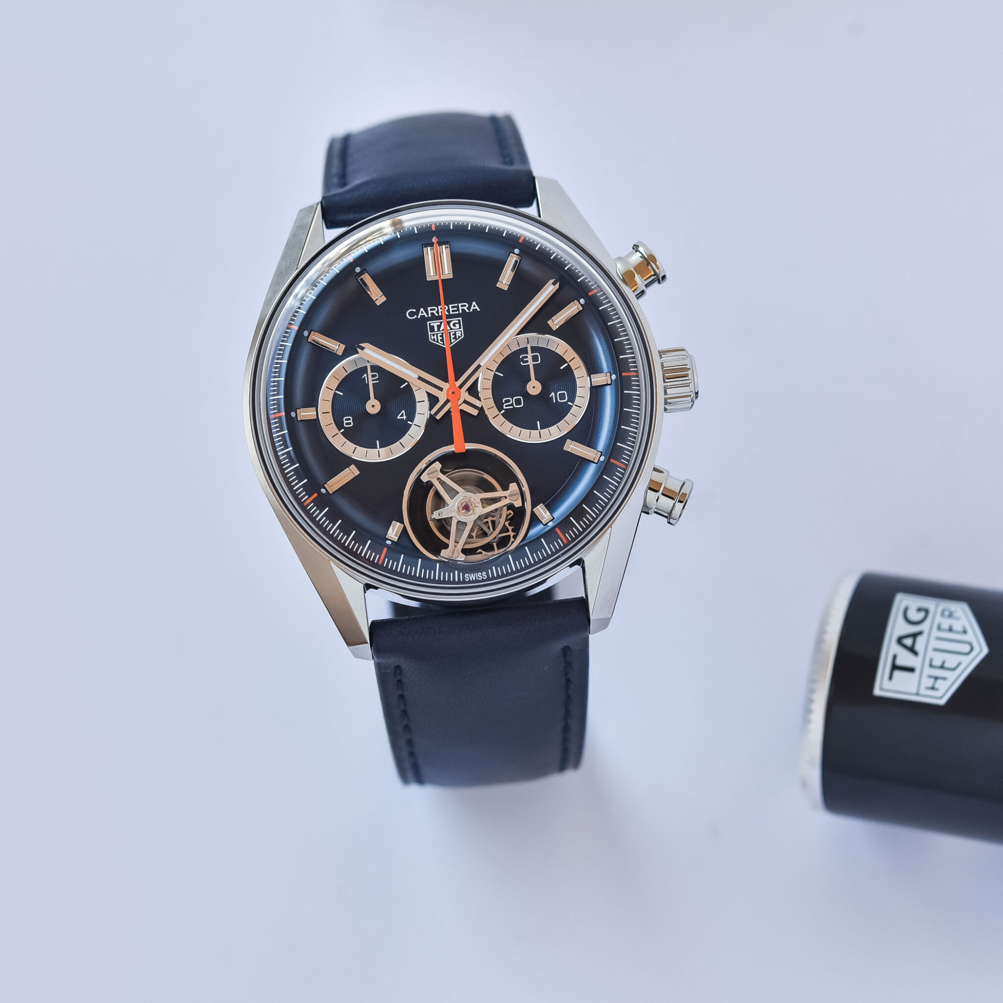 La réplica Carrera no es ajena al combo crono/tourbillon. Quién puede olvidar aquel épico día de 2016 en el que TAG Heuer lanzó su cronógrafo integrado y movimiento tourbillon Carrera Heuer-02T con certificación de cronómetro a un precio increíblemente competitivo de 15.000 CHF? Los modelos Heuer-02T, que a lo largo de los años han aparecido en diversas formas, como esta versión Nanograph de alta tecnología con espiral de composite de carbono y la edición Mario Kart, cuentan con esferas esqueletadas contemporáneas y grandes cajas de 45 mm.